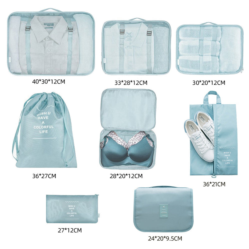 • 【Hohe Kapazität】1. Kleidersack L: 10-12 Hemden; 2. Kleidersack M: 6-8 Hemden; 3. Kleidersack S: 4-6 Hemden; 4. BH-Unterwäschetasche: für BH-Unterwäsche und Socken; 5. Schuhbeutel: 1 Paar Turnschuhe; 6. Kulturtasche: für Ihre Kulturutensilien, persönliche Kosmetika und Toilettenartikel; 7. Flache Tasche: kann elektronisches Zubehör oder leichte und kleine Gegenstände nach persönlichen Vorlieben aufbewahren; 8. Bündeltaschen: Es kann Schuhe aufbewahren, hat eine Vielzahl von Verwendungsmöglichkeiten und kann Gegenstände nach persönlichen Bedürfnissen platzieren.