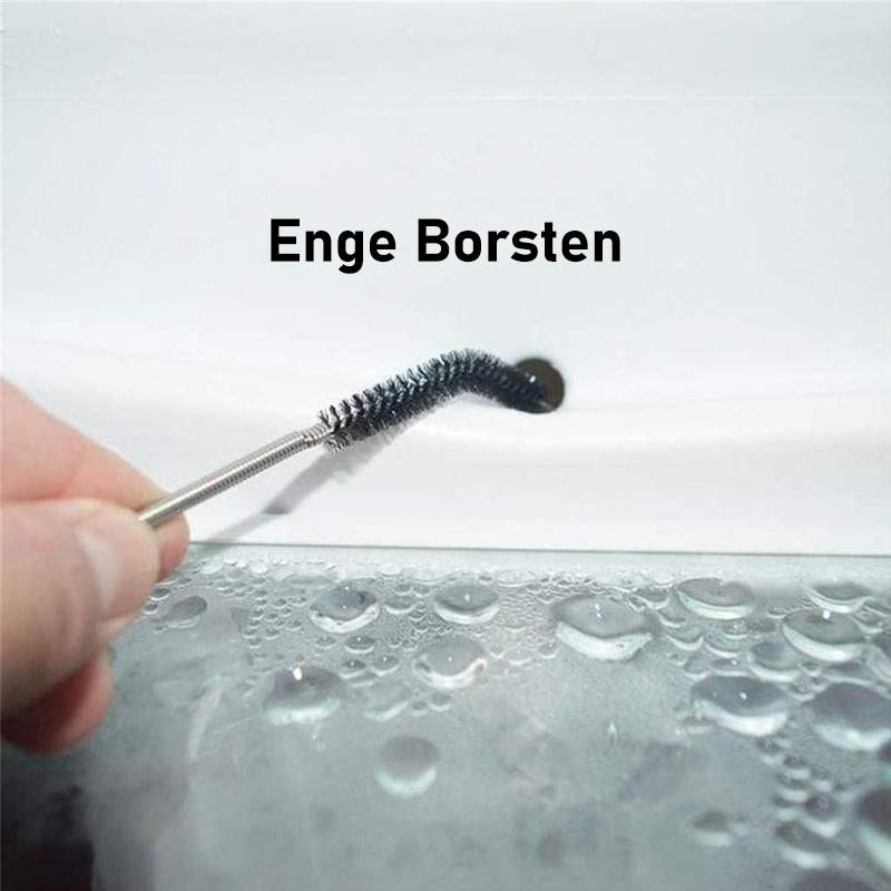 Führen Sie den flexiblen Stiel (Bürstenende zuerst) in den Schlauch ein und schrubben Sie die Innenseite vorsichtig, während Sie die Bürste wieder herausarbeiten. Der flexible und dennoch robuste Drahtkörper schlängelt sich mühelos durch und geht tief in jeden Abfluss.