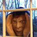 Mit seinen starrenden Augen, den gerunzelten Brauen und den um das vernarbte Gesicht gelegten Händen gibt es keinen Zweifel daran, was der "Scary Peeper Creeper" nachahmen soll: den Kopf eines "Spanners", der durch ein Fenster späht.
