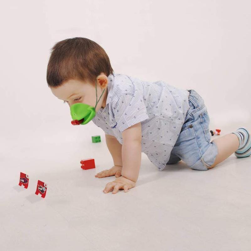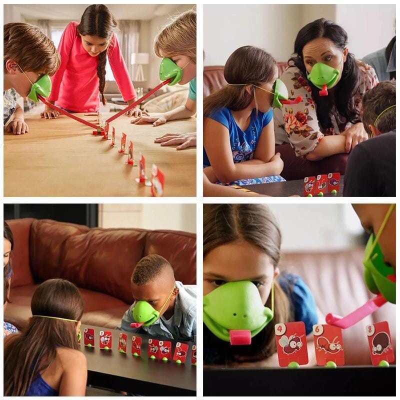 Beide Spieler dieses unterhaltsamen Spiels tragen Chamäleon-Mundmasken mit verlängerten roten Zungen.