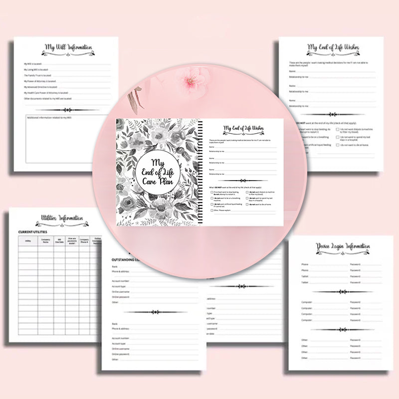Unser umfassender und humorvoller End-of-Life-Planer enthält alles, was Ihre Familie und/oder Freunde wissen müssen, wenn Sie sterben oder handlungsunfähig werden... von Finanzinformationen über Versicherungsinformationen bis hin zu Pflegewünschen am Lebensende und mehr!