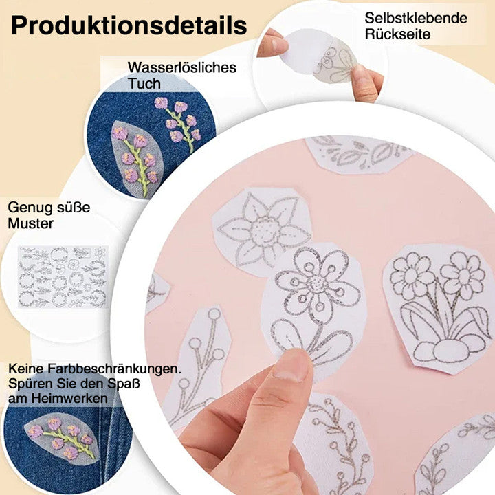• Einfach zu bedienen: Ziehen Sie einfach die Musterunterlage vom Liner ab, kleben Sie das Muster auf den Stoff oder das Kleidungsstück, das Sie verschönern möchten, und beginnen Sie mit dem Sticken. Nachdem Sie fertig sind, spülen Sie es mehrmals mit lauwarmem Wasser ab. Nach dem Trocknen entsteht ein schönes Muster