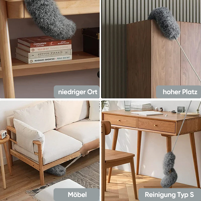 • Leicht zu reinigen und aufzubewahren: Unser Staubwedelkopf ist abnehmbar. Sie können ihn mit warmem oder leicht heißem Wasser von Hand waschen, trocknen und aufbewahren.