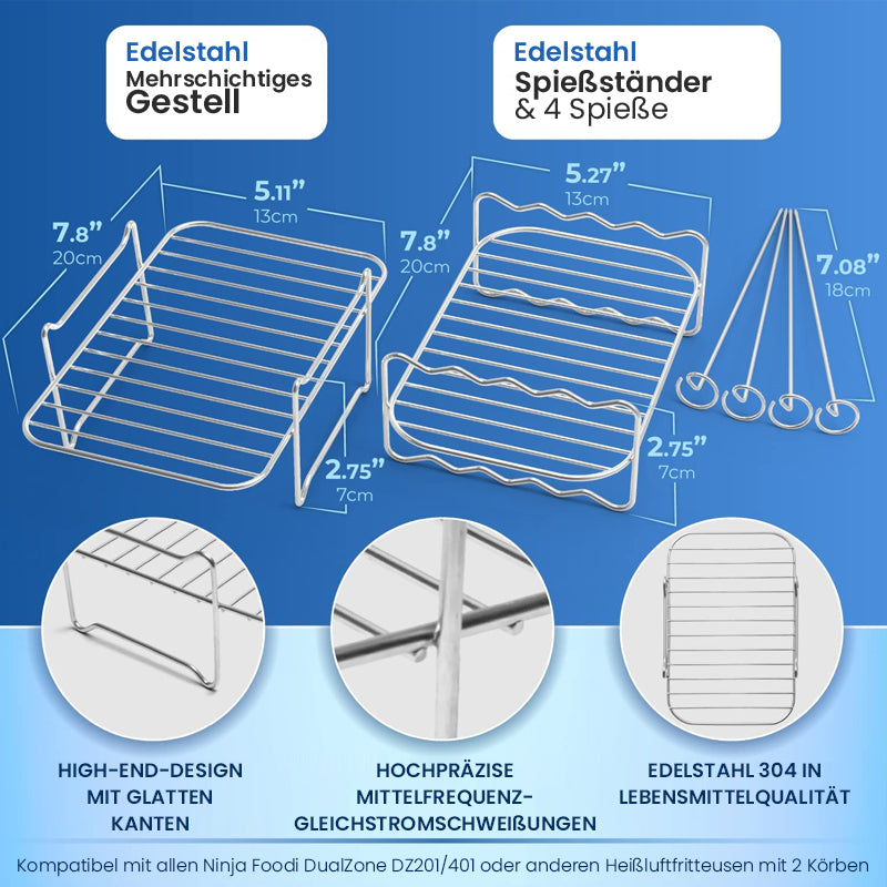 • ✅ Vielseitige Verwendungsmöglichkeiten: Die Edelstahl-Heißluftfritteusengestelle sind mit einer versetzten Höhe konstruiert, sodass Sie das Gestell umdrehen können, um es auf beiden Seiten zu verwenden. Dies gibt Ihnen mehr Platz für größere Portionen von Lebensmitteln und ist dank der glatten, polierten Kanten ein Kinderspiel zu reinigen und zu verwenden.