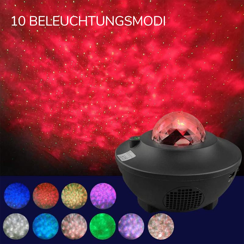 Durch die Kombination von Blau, Rot, Grün und Weiß können Sie einfarbige oder mehrfarbige Lichteffekte projizieren, um 10 Lichteffekte zu bilden. Es stehen 3 Helligkeitsstufen zur Auswahl (30 %; 60 %; 100 %). Eine Vielzahl von Farben kombiniert mit unterschiedlichen Geschwindigkeiten, um die gewünschte Atmosphäre zu schaffen, bringt Ihnen ein magisches Erlebnis.
