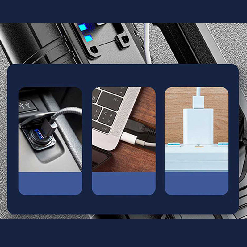 Diese LED-Taschenlampe wird mit einem Quad-Core-P700-Docht geliefert. Diese Taschenlampe verwendet einen wiederaufladbaren 18650-Akku und zum Aufladen stecken Sie einfach das USB-Kabel in das Gehäuse der Taschenlampe. Diese Taschenlampe hat auch eine tragbare Form, so dass es obligatorisch ist, sie überall hin mitzunehmen und im Notfall zu verwenden