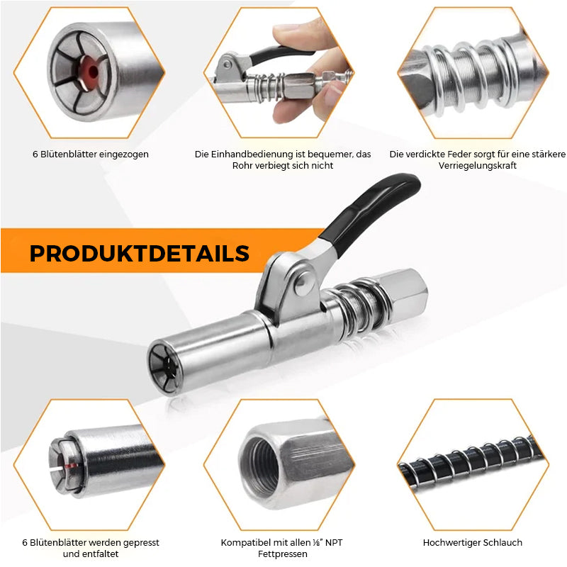 • 【Verbesserte Leckagezange】: Der Fettpressenkoppler verfügt über einen leistungsstarken 6-Backen-Koppler. Die verstärkten Backen und hochwertigen Dichtungen der Fettpressenkupplung sorgen für eine langzeitstabile Leistung und verhindern Leckagen selbst bei einem extremen Druck von 17000 PSI, sodass Sie effizient arbeiten können.